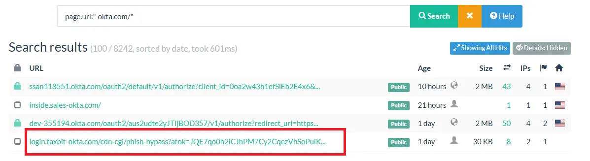 This query returned a recent hit, inside.sales-okta[.]com, indicating continued or renewed use of Okta-themed domain impersonation consistent with Scattered Spider tradecraft.