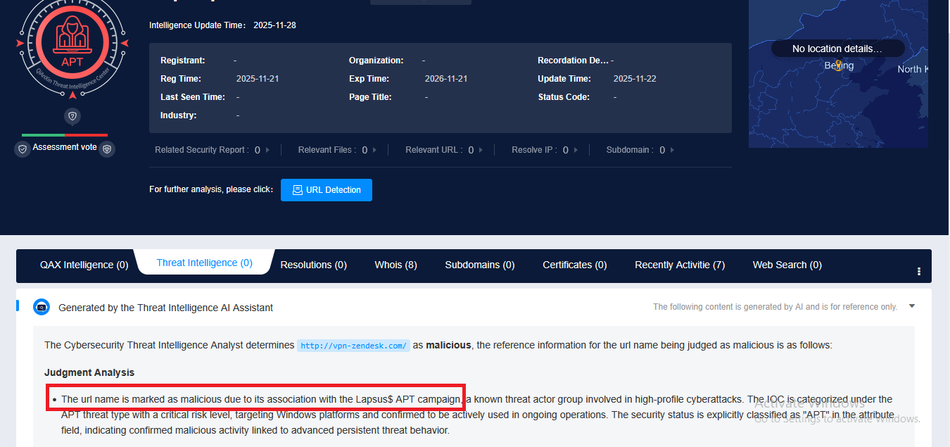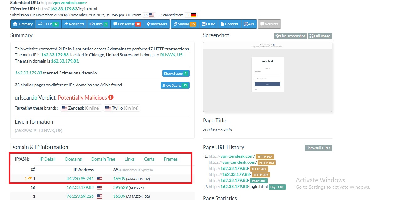 As anticipated, the analysis confirmed that the identified domain vpn-zendesk[.]com belongs to Scattered Spider.