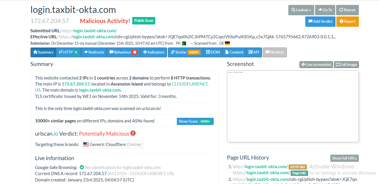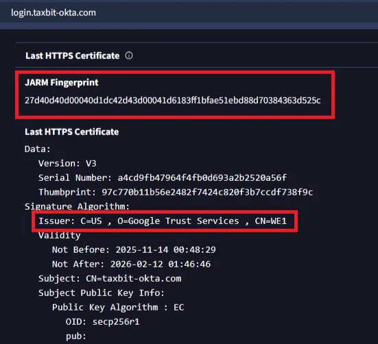 Another previously identified domain, login.taxbit-okta[.]com, also aligned with Scattered Spider naming conventions.