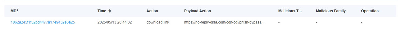 Other identified domains: login.taxbit-okta[.]com, ov-okta[.]com, no-reply-okta[.]com did not appear to host active services; however, a downloadable file was observed on the domain. Investigation revealed that this file shared the same IOCs previously confirmed in a known Scattered Spider domain, vpn-zendesk[.]com, reinforcing its linkage to the groupβs infrastructure.