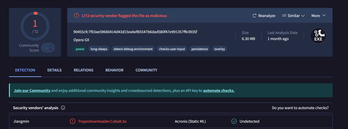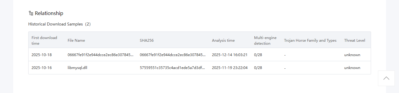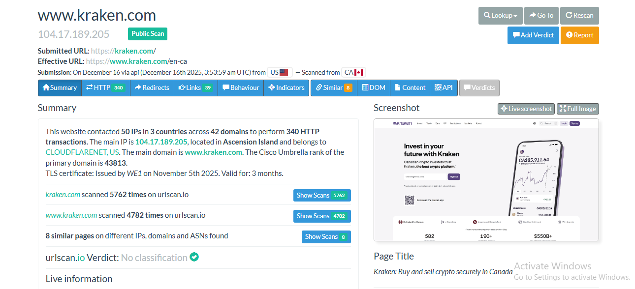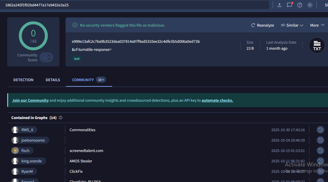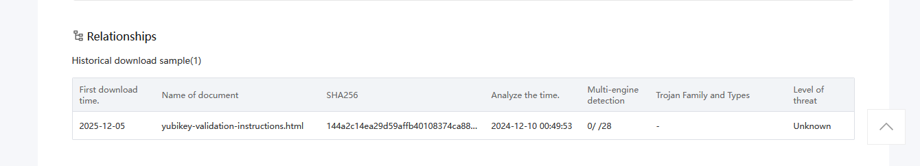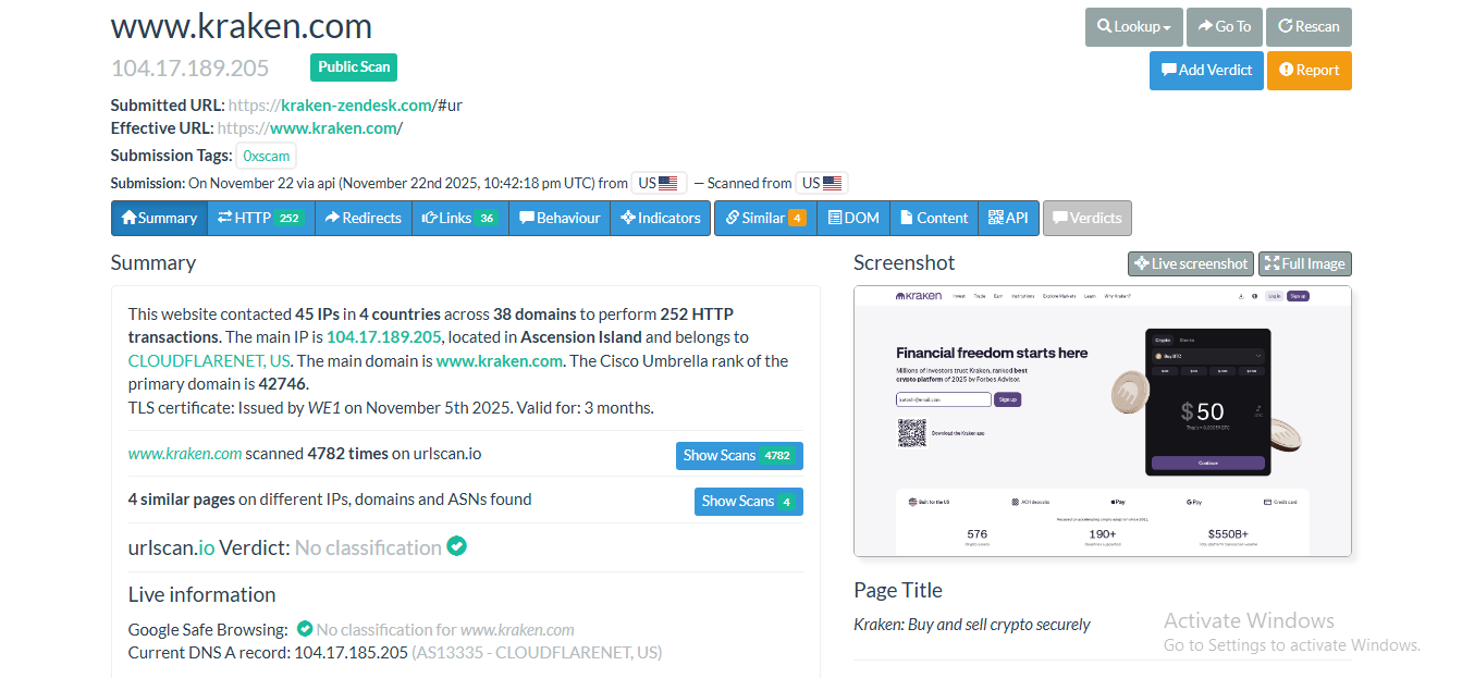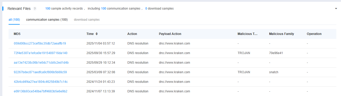 Using the same JARM fingerprint, we identified an additional domain, kraken-zendesk[.]com, which impersonates Kraken, a U.S.-based cryptocurrency exchange. While the domain itself does not directly host malicious content, its effective URL resolves to www.kraken[.]com, where multiple downloadable files were observed. Notably, files identified in 2025 were assessed as malicious, indicating potential abuse of redirection or trusted-brand association consistent with Scattered Spider delivery tactics.