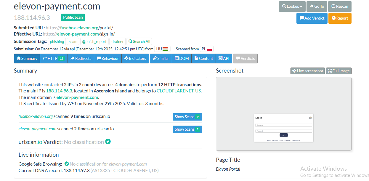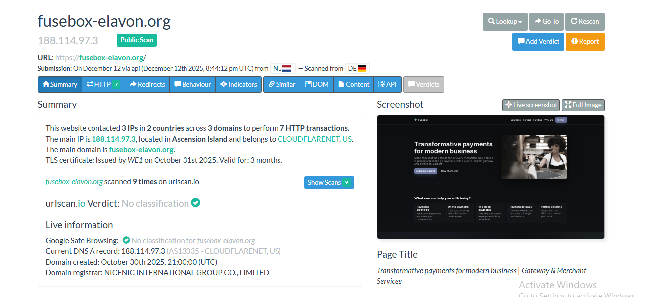 Linked to this infrastructure, we identified an additional domain, fusebox-elavon[.]org, which also impersonates Elavon and hosts the same downloadable file observed across other confirmed Scattered Spider domains.