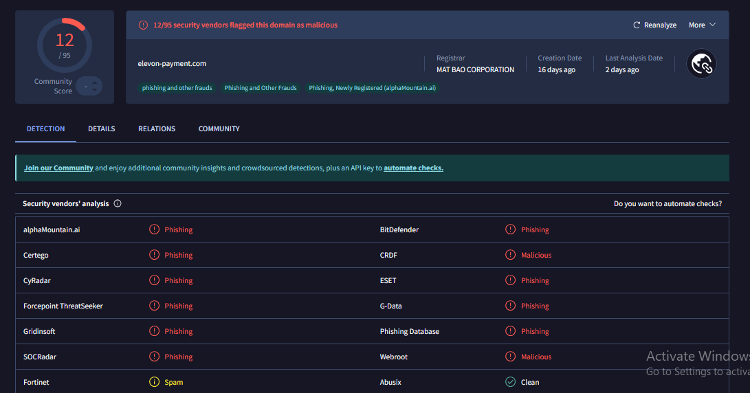 Domain elevon-payment[.]com impersonates Elavon Inc., a U.S. Bancorp subsidiary.