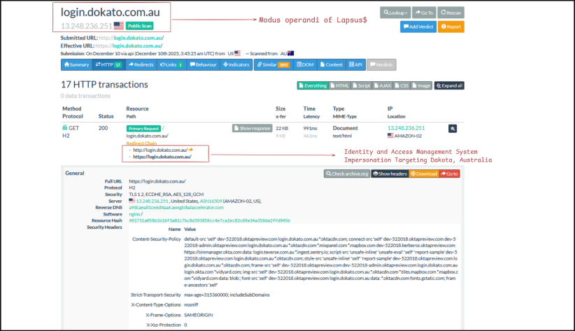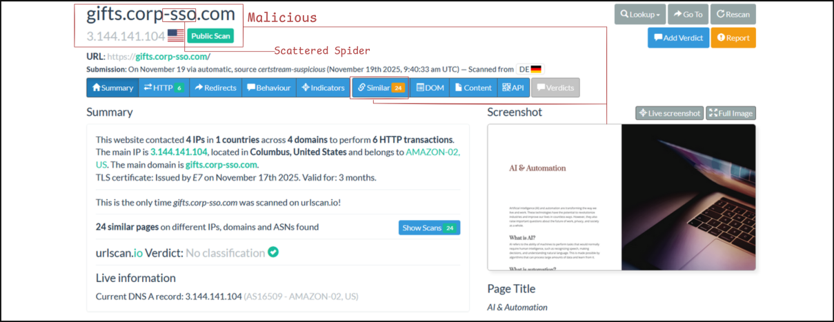 This investigation reveals the extensive infrastructure footprint maintained by Scattered Spider, demonstrating a systematic approach to brand impersonation, identity infrastructure abuse, and credential harvesting operations.