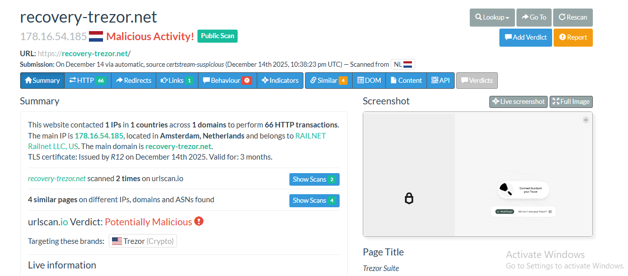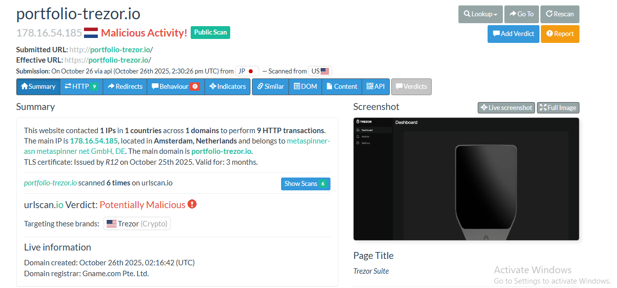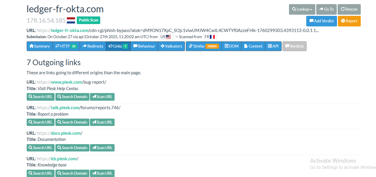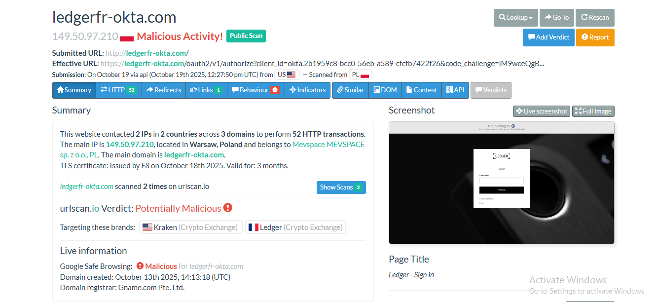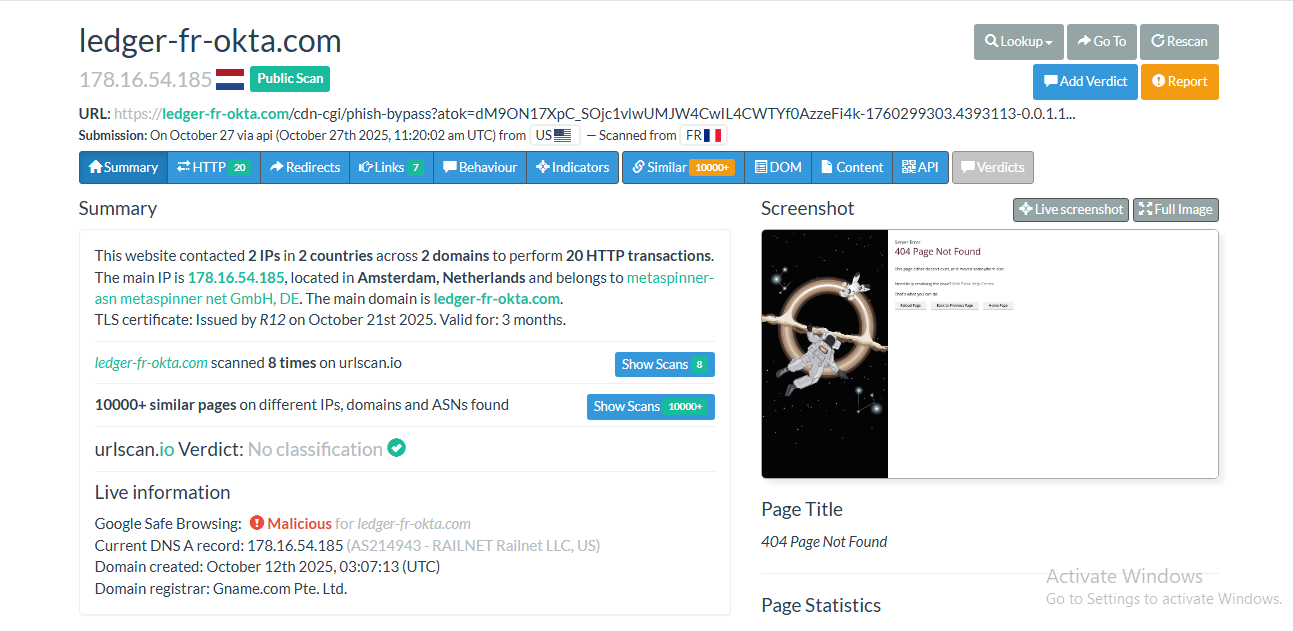 Returning to our initial hypothesis, we continued searching for domains ending in β-okta[.]comβ and identified ledgerfr-okta[.]com. Given Scattered Spiderβs previously observed involvement in cryptocurrency-related targeting, the impersonation of Ledger, a widely used crypto hardware wallet provider, suggests a likely attempt to abuse trusted crypto infrastructure as part of social engineering or credential-harvesting activity.