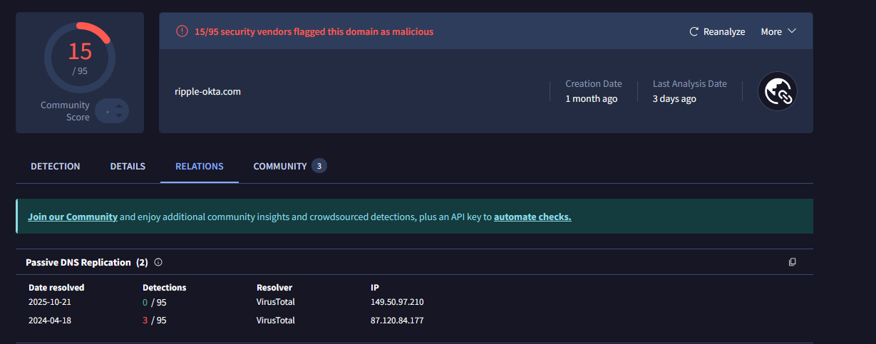 Some domains found on the IP 149.50.97[.]210, are ripple-okta[.]com, 8923930[.]com with recent creation dates, indicating it's part of the same fresh campaign.