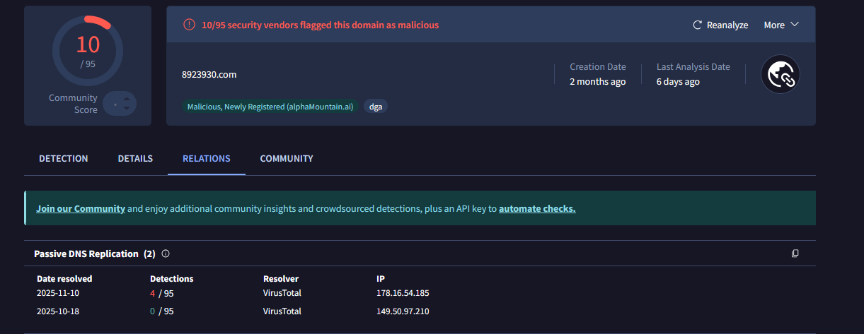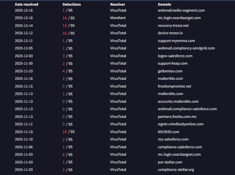 Identified multiple domains hosted on it that are linked to confirmed Scattered Spider infrastructure.