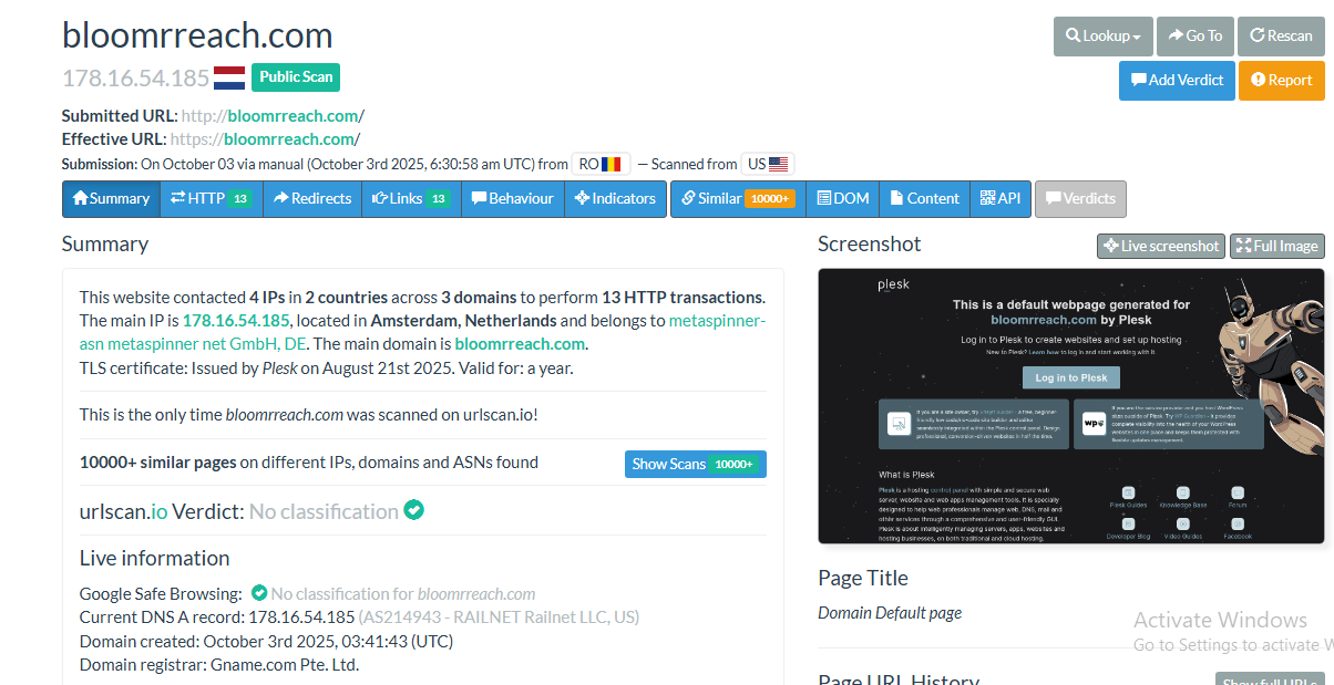 Although the page itself exposed minimal content, it revealed key metadata including ASN13335, which enabled further pivoting across multiple intelligence platforms.
