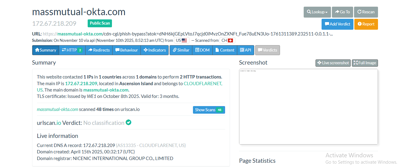 We identified an additional domain, massmutual-okta[.]com, which was not actively serving visible content at the time of analysis; however, behavioral indicators suggest it was functioning as C2 endpoint.